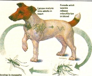 Různé druhy komárů mohou přenášt infekční larvy ( 3.stadium ) kousnutím psa. Larva migruje přes ústní ústrojí komára do těla zvířete. Místo po kousnutí asi týden po infekci pelichá. V podkoží se vyvíjí 4. larvární stádium a vede k dalšímu pelichání asi 2 měsíce po infekci. Během 3. až 4. měsíce po infekci mladí dospělci ( 2 až 4 cm dlouzí ) migrují do cílového orgánu ( plicní tepny, pravého srdce, duté žíly ). Někteří dospělci mohou také migrovat do břicha, centrální nervové soustavy, očí, průdušek a dalších orgánů. Během dalších 3 měsíců dorostou do délky 10 až 30 cm a pohlavně dospějí. Začnou uvolňovat larvy 1. stádia, nazývané mikrifilárie ( cca 0,3 mm ). Prepatentní doba je asi 6 měsíců. Mikrofilárie přežívají okolo 2 let a dospělci, nazývaní makrofilárie, asi 7 let. Komáři při kousnutí nakaženého psa naberou i mikrofilárie. V komárech dochází k vývoji parazita na 2. larvární stádium a na infekční 3. larvární stádium během několika týdnů.
